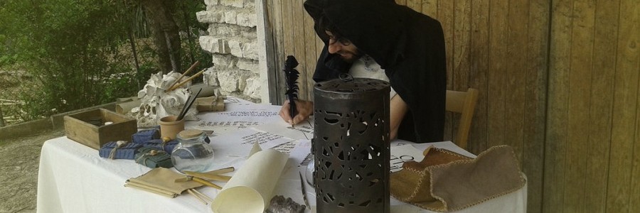 Scrittura Medievale. Un amanuense in rievocazioni storiche medievali: Calligrafia medievale e scritture storiche. Scriptorium di calligrafia medioevale e rinascimentale: gotico, onciale, italico, capitale romano, corsivo inglese e altri caratteri storici. Utilizzo di pennini tronchi e flessibili, inchiostri naturali, chine colorate, carte pregiate e pergamene. Performance calligrafiche dal vivo, in un allestimento medievale filologicamente curato e costume storico. Un amanuense di scrittura medievale per rievocazioni storiche.
