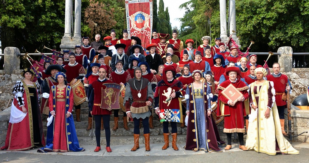 La gara è preceduta da un austero ma vivo e policromo corteo, composto da oltre 150 persone che indossano fedeli riproduzioni di costumi medievali. Il Corteo sfila per le vie cittadine fino ad arrivare nella duecentesca piazza del Duomo, stupenda cornice in cui si svolge la gara.
