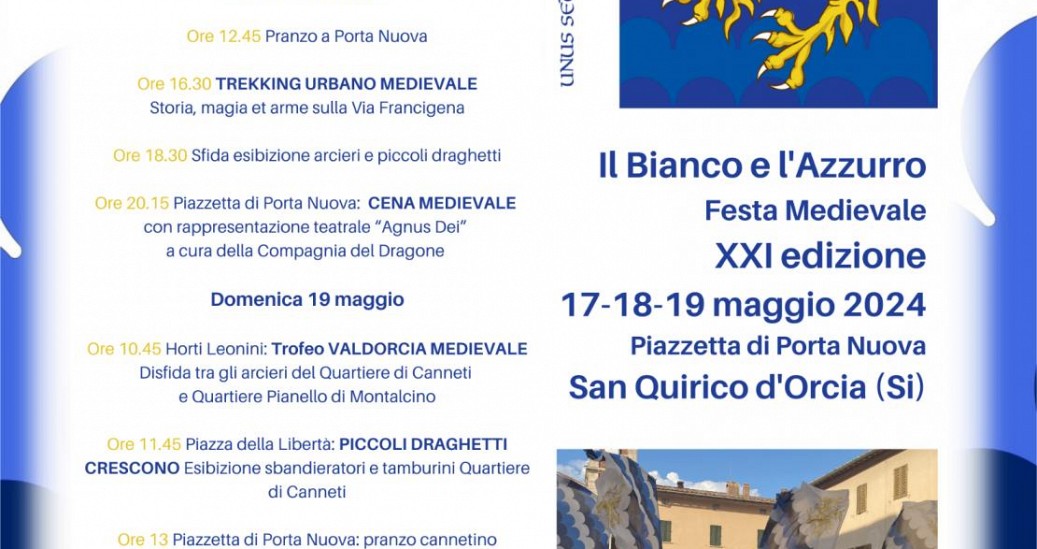 Al via la tre giorni medievale a tinte biancazzurre in Val d’Orcia. Nel segno della rievocazione storica e dello spettacolo, con i sapori della cucina medievale e cucina tipica valdorciana, il fascino senza tempo dell’Età di mezzo. Un tuffo nella storia in programma dal 17 al 19 maggio a San Quirico d’Orcia (Si), per la 21esima edizione de Il Bianco e l’Azzurro, la kermesse medievale organizzata dal Quartiere di Canneti. La manifestazione è inserita nel programma delle Rievocazioni storiche della Regione Toscana ed ha il patrocinio del Comune di San Quirico d’Orcia.